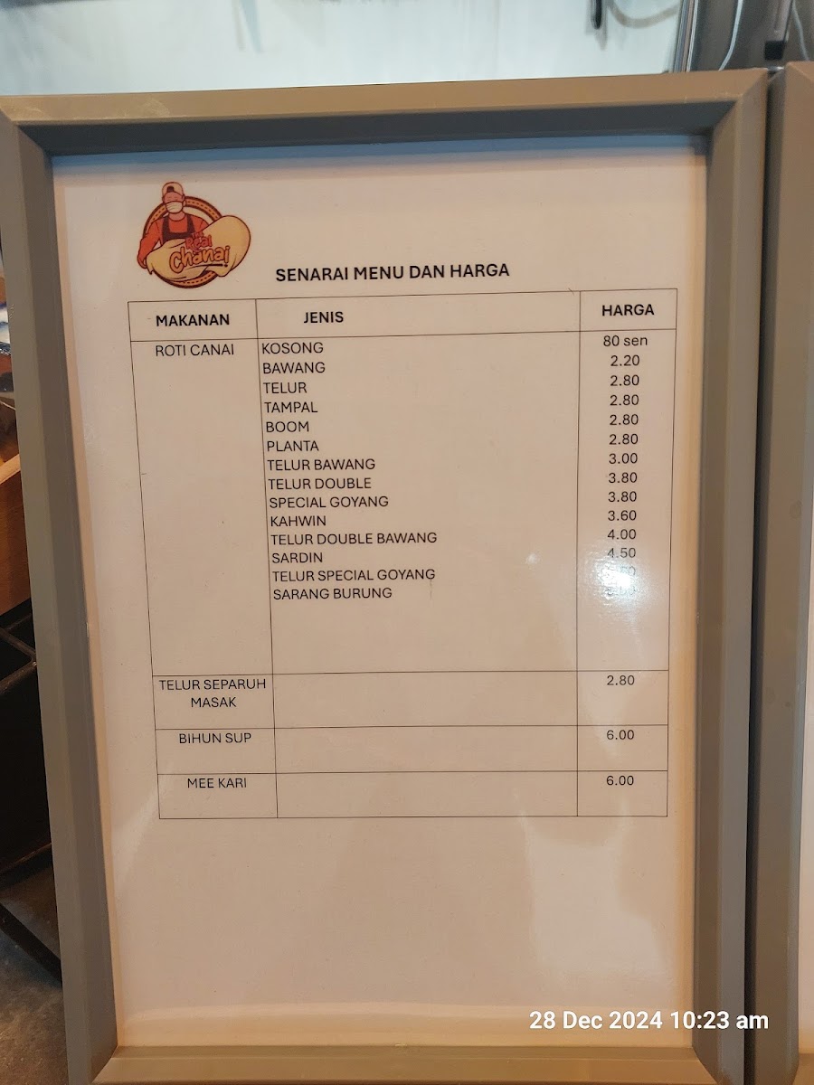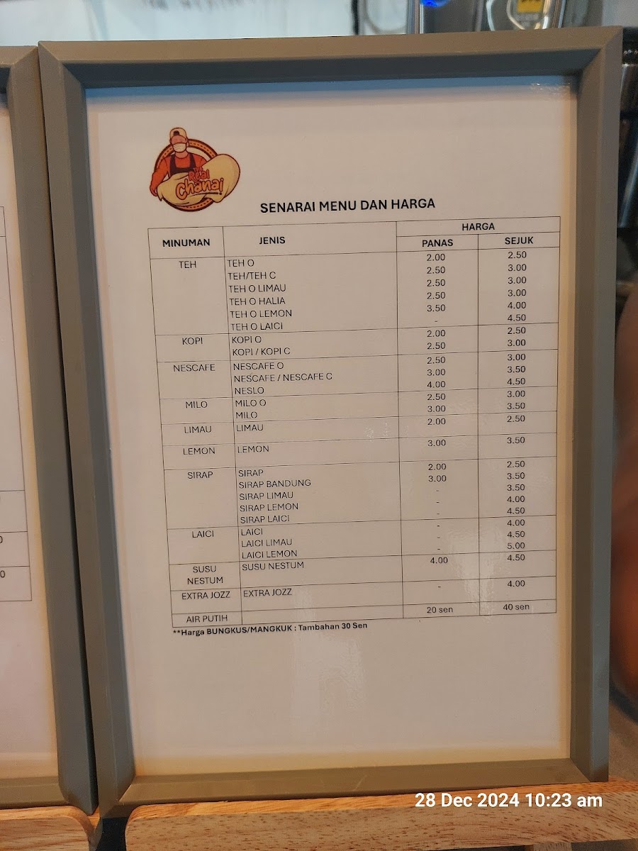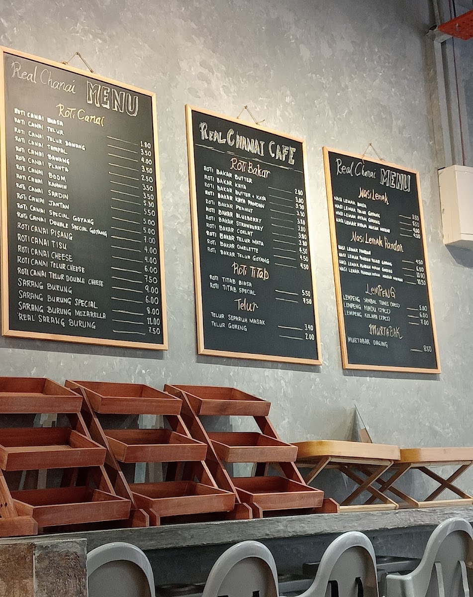 The menu at THE REAL CHANAI CAFE offers a variety of local cafe-style food and beverages. While specific menu items are not listed in detail, the offerings include a range of traditional Malaysian breakfast and light meal options centered around roti canai and related dishes. Customers can expect choices suited for breakfast or casual dining, with accompanying beverages such as kopi o and iced coffee.
